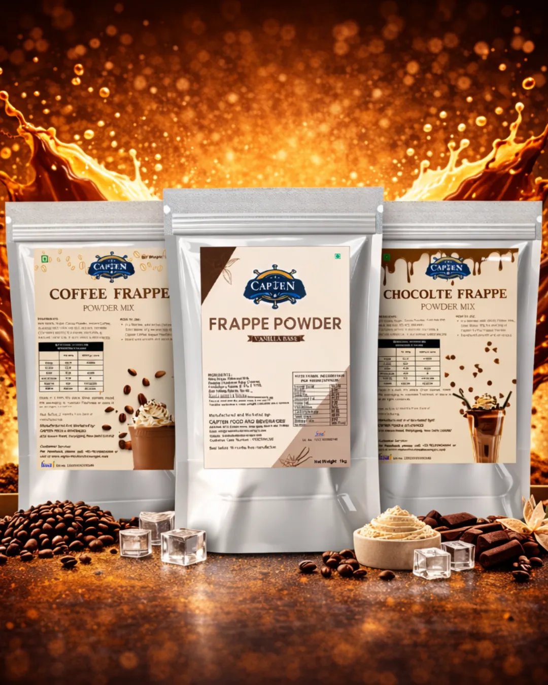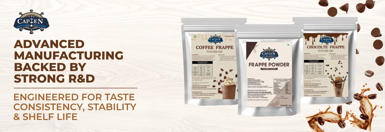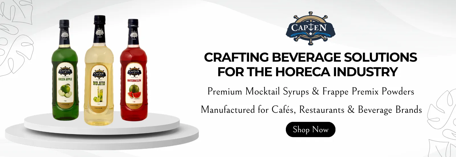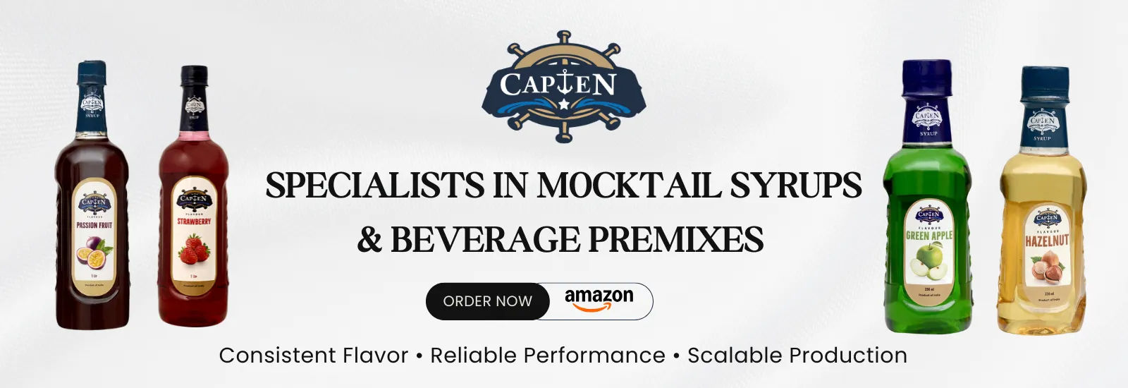 Capten Food & Beverages manufactures a range of mocktail syrups and frappe premix powders, developed specifically for cafés, restaurants, hotels, QSRs, cloud kitchens, and beverage-focused businesses.