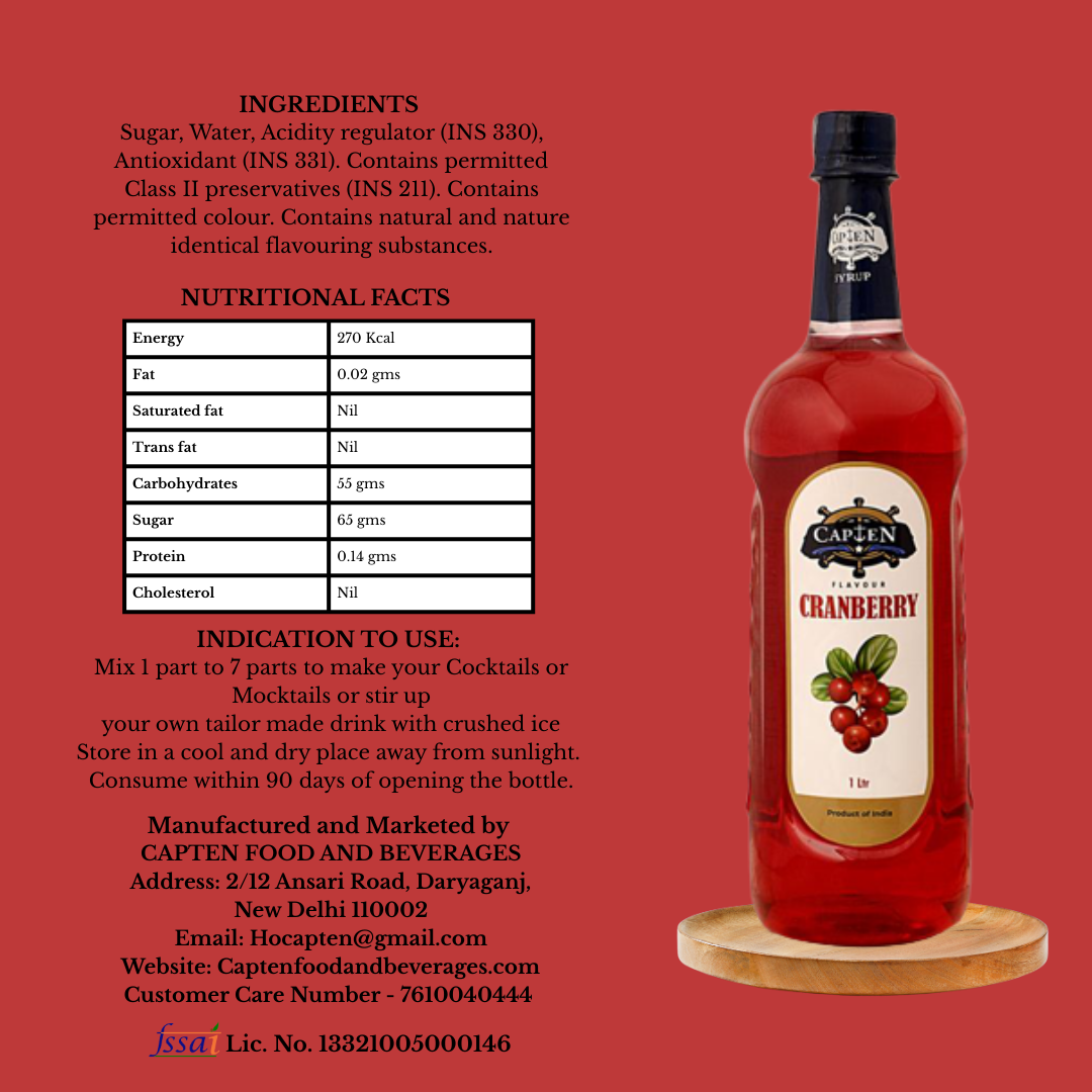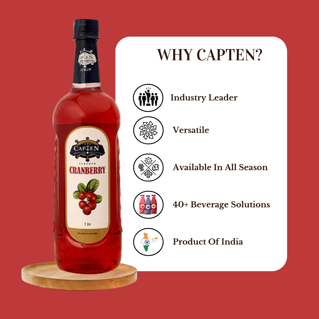 CAPTEN Cranberry Fruit Syrup 1L | Perfect Mixer For Enhancing Mocktails & Cocktails, Drinks, And Mojitos At Parties, Conveniently Packaged in a Bottle