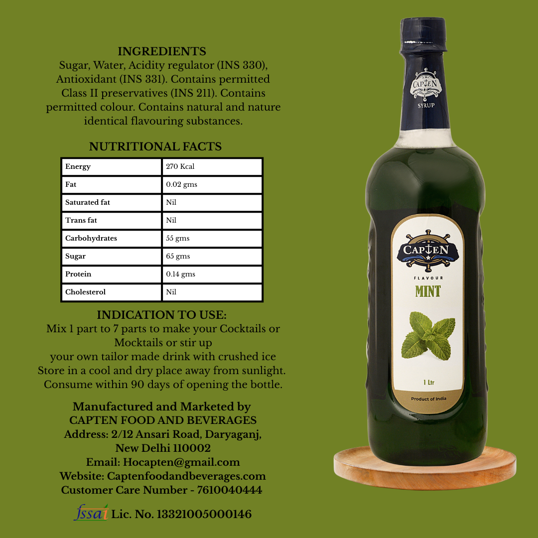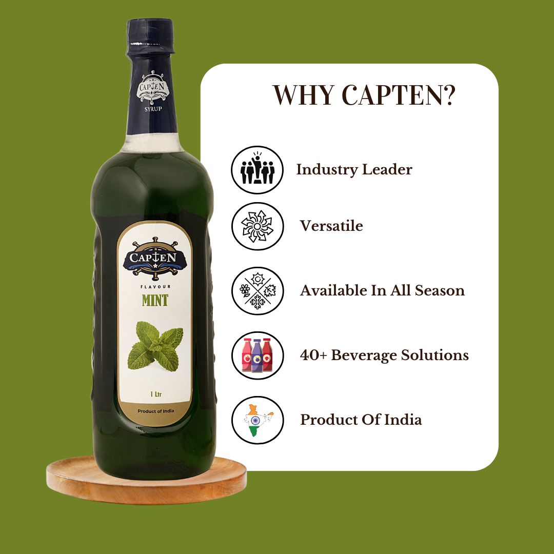 CAPTEN Mint Flavoured Syrup 1L | Suitable For Mocktails, Cocktails, Party Juices, Beverages | Non Alcoholic | Summer Drink Mix